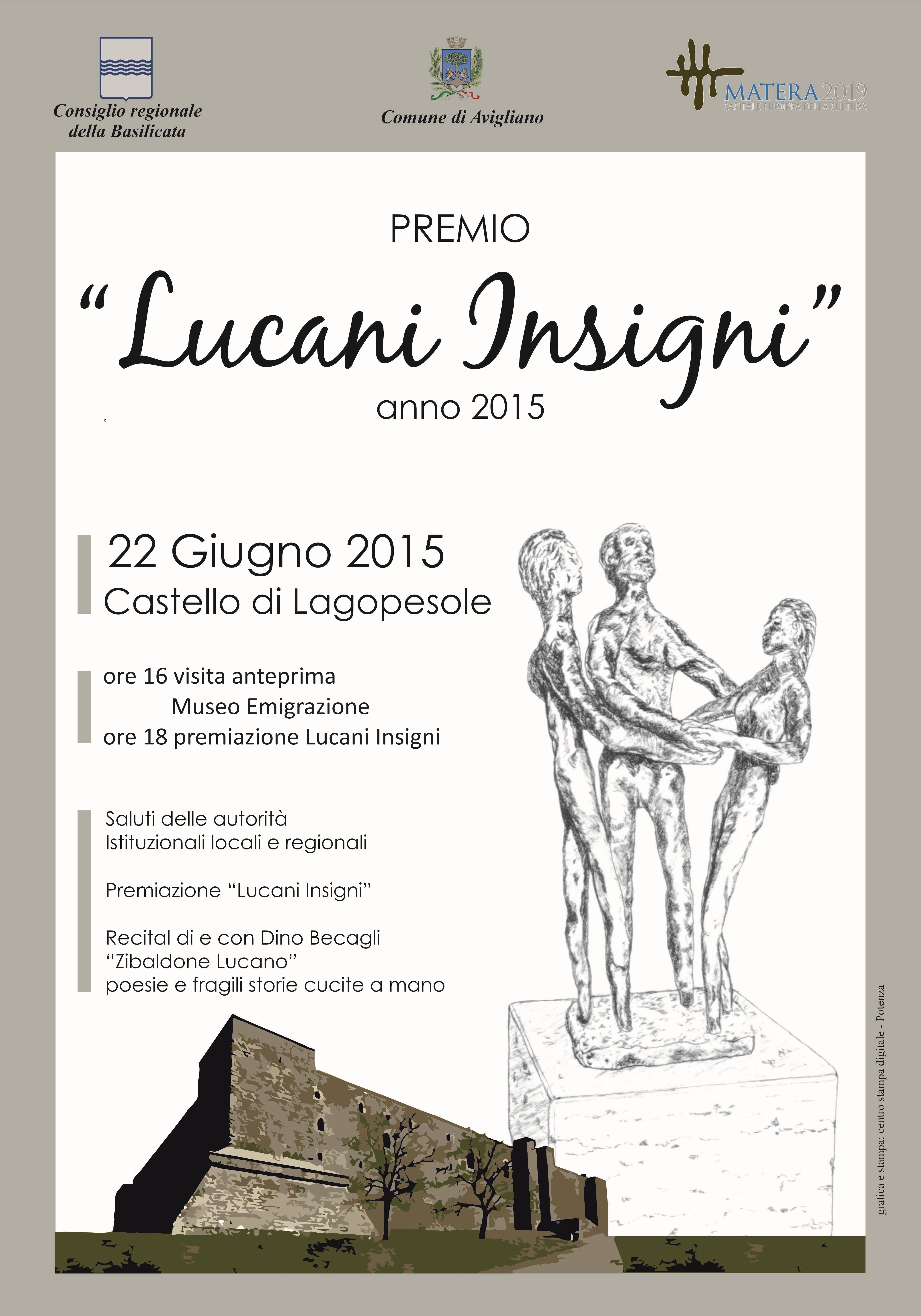 Subito dopo, alle ore 18,00, si svolgerà la cerimonia di premiazione dei lucani insigni 2015. Si tratta di cinque personalità che si sono distinte per meriti raggiunti in campo sociale, scientifico, artistico e letterario, oltre che nella diffusione e nella conoscenza dell’identità lucana. I vincitori sono il soprintendente speciale di Pompei, Ercolano e Stabia, Massimo Osanna, la biologa Cristina Ferrone, l’architetto Amerigo Restucci, l’avvocato Canio Kenneth Cancellara e l’imprenditore Victor Salvi, recentemente scomparso.  Alla regista televisiva Matilde D’Errico, all’antropologo Angelo Lucano Larotonda e alla memoria di Vincenzo Leggieri, sindaco di Venosa e senatore, sarà conferita un’onorificenza. Sarà presente alla manifestazione l’ambasciatore del Paraguay, Martin Llano-Heyn Materi.